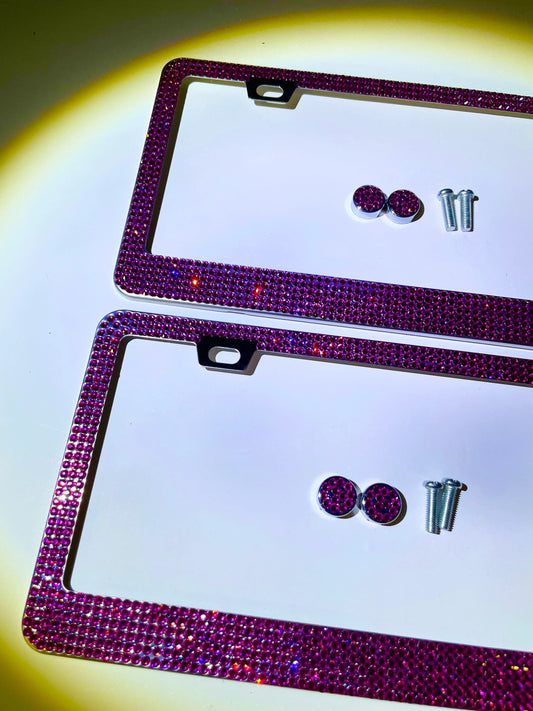 2 Luxury HOT PINK FUCHSIA Rose Crystal Diamond Crystal License Plate Frame Sparkle Lux Narrow Top anti-theft Cover Holder Bling Caps