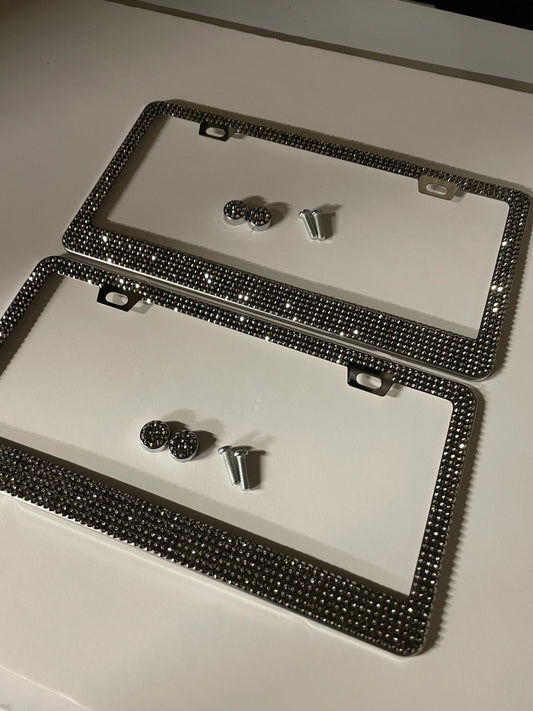 2 Jet Hematite Crystal Metallic Silver Diamond Crystal Encrusted Sparkly Luxury Metal License Plate Frames Bling Caps