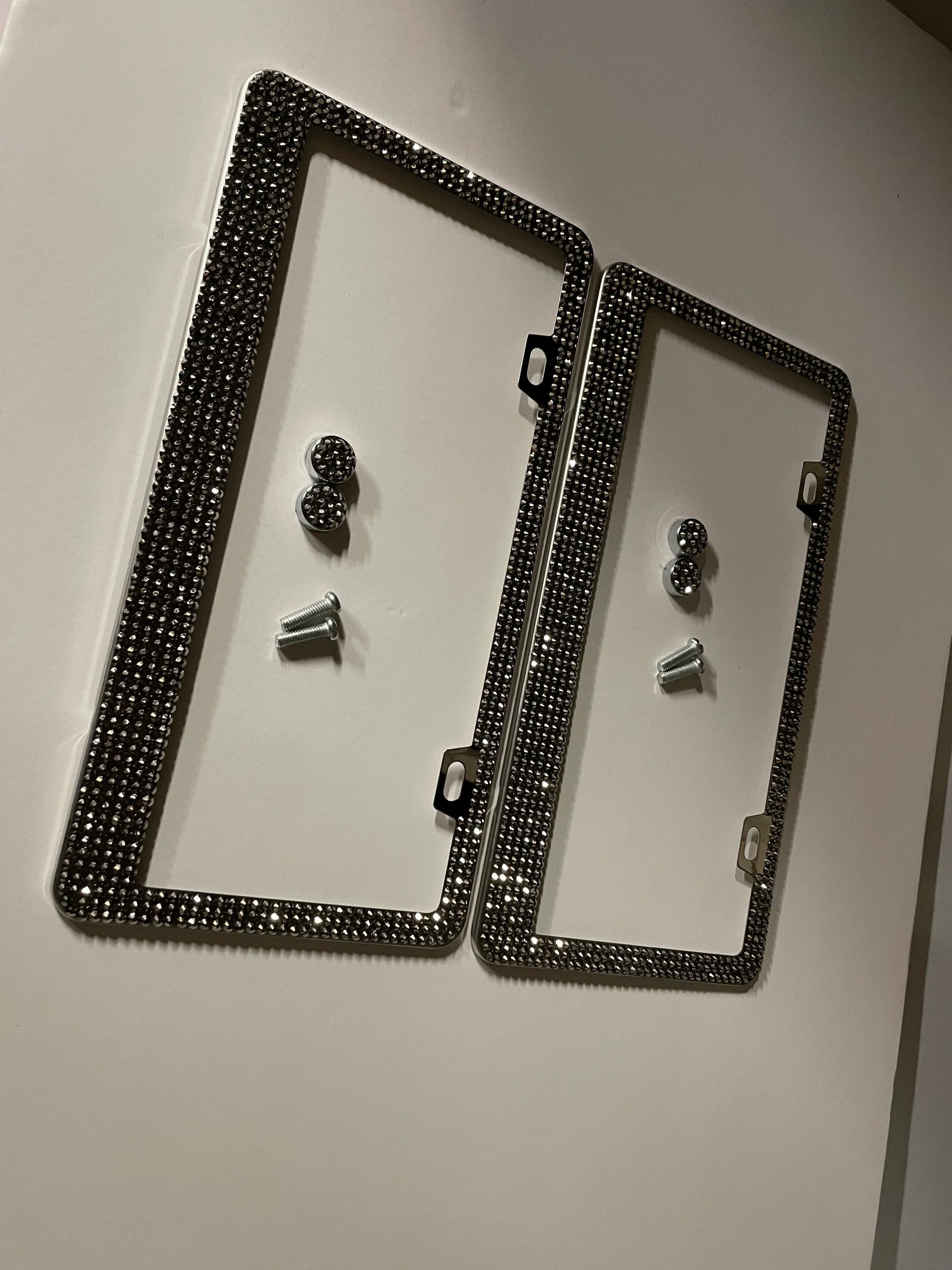 2 Jet Hematite Crystal Metallic Silver Diamond Crystal Encrusted Sparkly Luxury Metal License Plate Frames Bling Caps