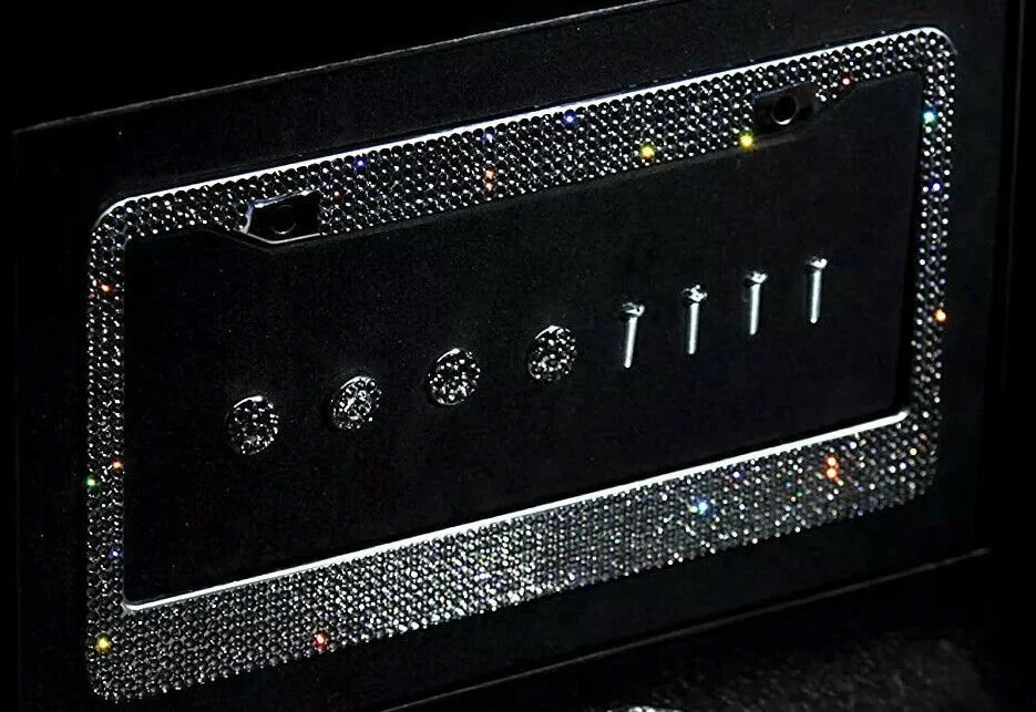 2 Luxury GREY Gray Diamond CRYSTAL Encrusted License Plate Frame anti-theft Sparkle Lux Holder Cover Bling Caps