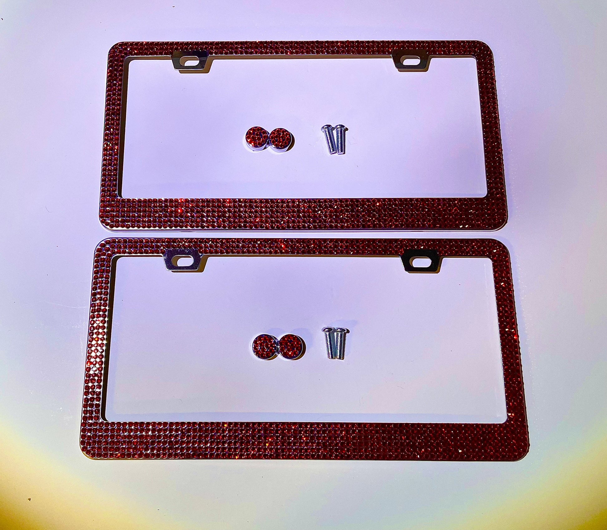 2 LUXURY RED LIGHT SIAM SWAROVSKI CRYSTAL ENCRUSTED LICENSE PLATE FRAMES