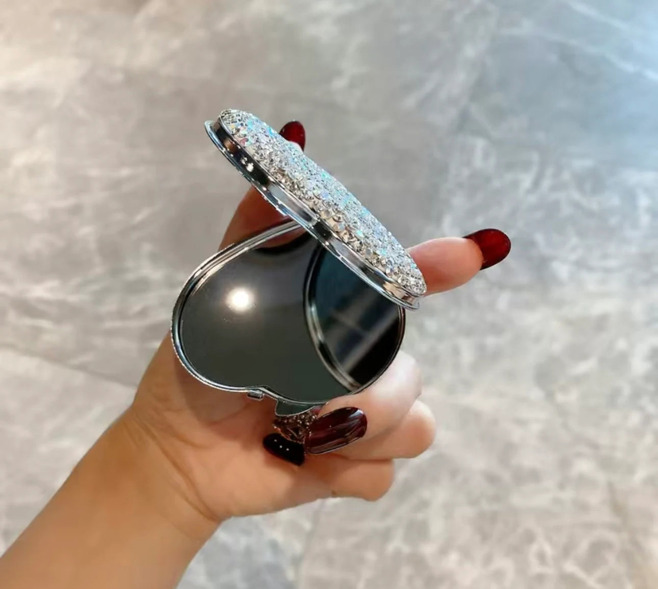 Crystal Encrusted Compact Mirror Heart Shape Blinged Out White Diamond & Aurora Borealis Makeup Mirror Folding Pocket Size Feminine Sparkly
